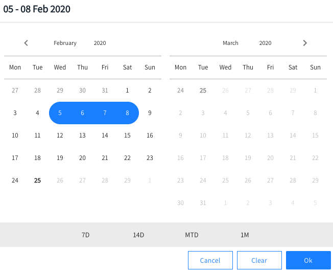• Custom: You can also create a custom time period by clicking on the calendar's start and end dates.